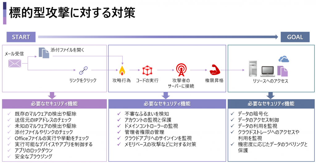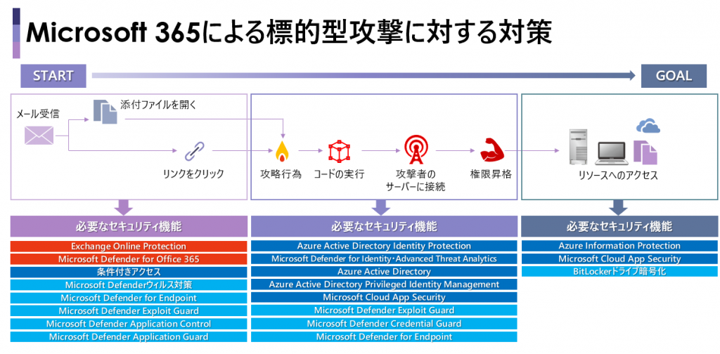 下図は、Microsoft 365 が持つ標的型攻撃に対する対策機能を記載したものです。