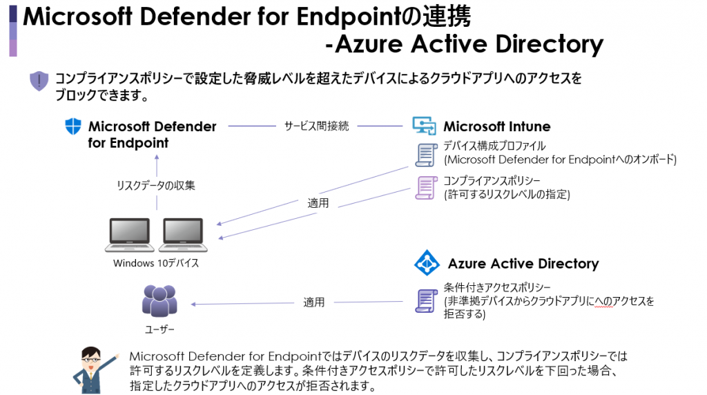 たとえば、Azure Active Directory と Microsoft Intune を Microsoft Defender for Endpointと連携すると、クラウドアプリのアクセス時に、Microsoft Defender for Endpoint で設定されたデバイスのリスクレベルを確認し、リスクレベルの高いデバイスからの接続をブロックするといったことが可能です。